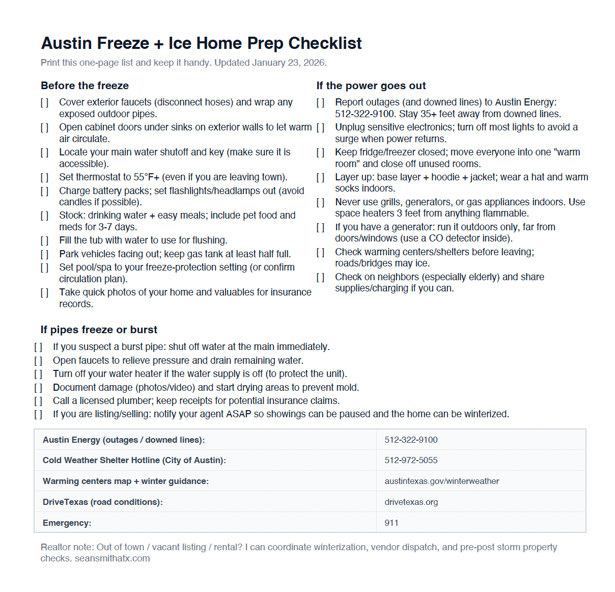 If you’re out of town, have a vacant listing, or manage rentals, winter weather is when small issues become big problems fast. I can coordinate pre-freeze walkthroughs, vendor dispatch (plumber/handyman), and post-storm checks so your property stays protected.
